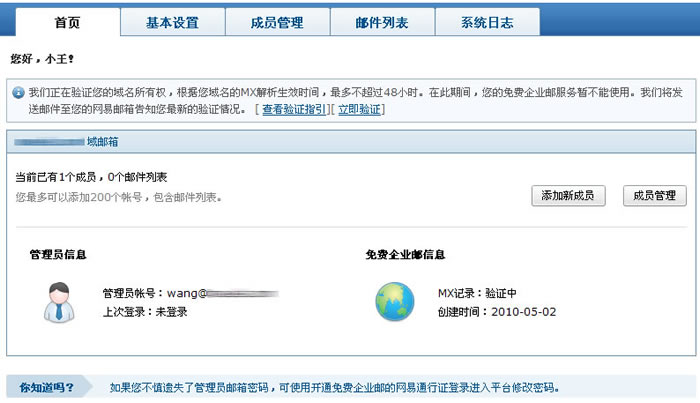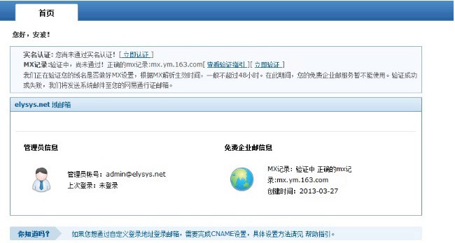 登录后,系统会提示您MX验证还没有通过,如果您还没有进行MX记录设置,则需要尽快完成。如果7天后验证还未通过,则意味着您创建此免费企业邮失败,无法使用该服务了。