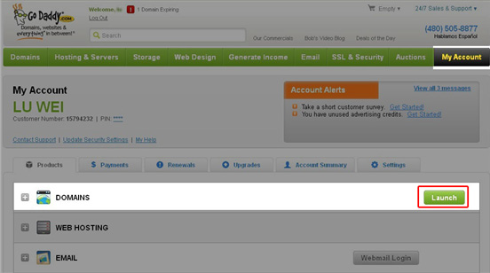第二步: 登录成功后,选择导航栏右侧“My Account”,点击“DOMAINS”选项栏里“Launch”按钮: