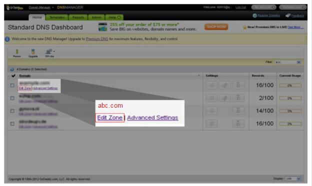 第四步: 打开“DNS Manager”,找到您需要改动解析的域名,点击该域名下方“Edit Zone”: