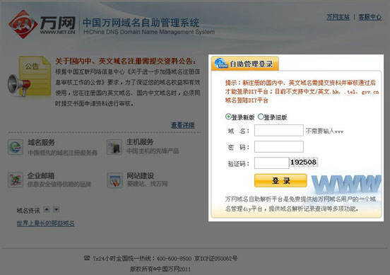 第一步:打开 http://diy.hichina.com,,输入域名、密码和验证码,点击“登录”: