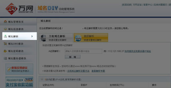 第二步: 成功登录后选择左侧“域名解析”: