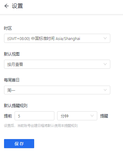 5、【新增】日历的全局设置。自定义“时区”、“默认视图”、“每周首日”等,设置更灵活。